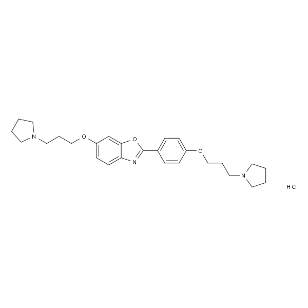 InChI=1S/C27H35N3O3.2ClH/c1-2-14-29(13-1)17-5-19-31-23-9-7-22(8-10-23)27-28-25-12-11-24(21-26(25)33-27)32-20-6-18-30-15-3-4-16-30;;/h7-12,21H,1-6,13-20H2;2*1H